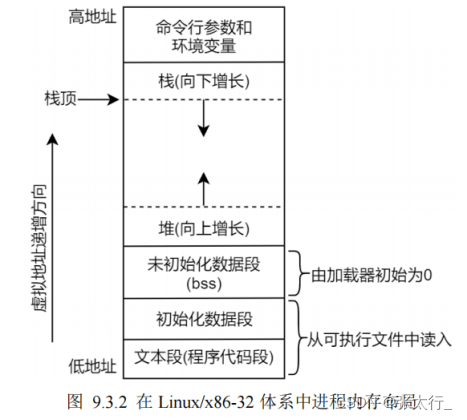 图 9.3.2 显示了这些段在内存中的典型布局方式,当然,并不要求具体的实现一定是以这种方式安排其存储空间,但这是一种便于我们说明的典型方式。