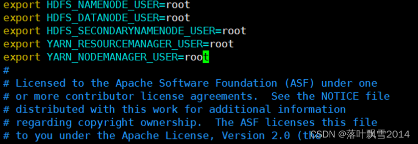 | export HDFS_NAMENODE_USER=root export HDFS_DATANODE_USER=root export HDFS_SECONDARYNAMENODE_USER=root export YARN_RESOURCEMANAGER_USER=root export YARN_NODEMANAGER_USER=root |