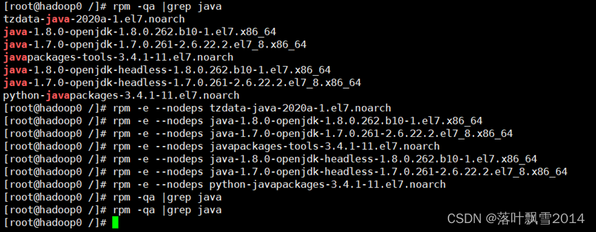 | [root@hadoop0 /]# rpm -qa |grep java tzdata-java-2020a-1.el7.noarch java-1.8.0-openjdk-1.8.0.262.b10-1.el7.x86_64 java-1.7.0-openjdk-1.7.0.261-2.6.22.2.el7_8.x86_64 javapackages-tools-3.4.1-11.el7.noarch java-1.8.0-openjdk-headless-1.8.0.262.b10-1.el7.x86_64 java-1.7.0-openjdk-headless-1.7.0.261-2.6.22.2.el7_8.x86_64 python-javapackages-3.4.1-11.el7.noarch [root@hadoop0 /]# rpm -e --nodeps tzdata-java-2020a-1.el7.noarch [root@hadoop0 /]# rpm -e --nodeps java-1.8.0-openjdk-1.8.0.262.b10-1.el7.x86_64 [root@hadoop0 /]# rpm -e --nodeps java-1.7.0-openjdk-1.7.0.261-2.6.22.2.el7_8.x86_64 [root@hadoop0 /]# rpm -e --nodeps javapackages-tools-3.4.1-11.el7.noarch [root@hadoop0 /]# rpm -e --nodeps java-1.8.0-openjdk-headless-1.8.0.262.b10-1.el7.x86_64 [root@hadoop0 /]# rpm -e --nodeps java-1.7.0-openjdk-headless-1.7.0.261-2.6.22.2.el7_8.x86_64 [root@hadoop0 /]# rpm -e --nodeps python-javapackages-3.4.1-11.el7.noarch [root@hadoop0 /]# rpm -qa |grep java |