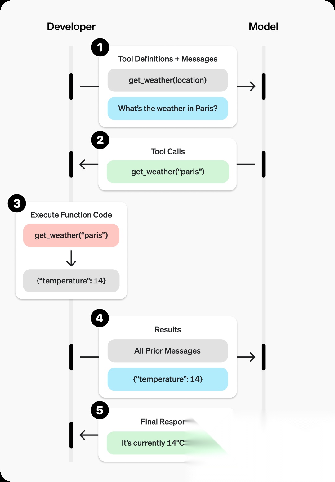 Result Submission),函数执行完毕后,应用程序将函数的返回值(无论是成功的结果还是错误信息)封装成一条新的消息,并将其发送回LLM。这条消息会与第一步中模型生成的函数调用请求相关联,形成上下文。 - • 步骤五:整合信息并生成最终响应(