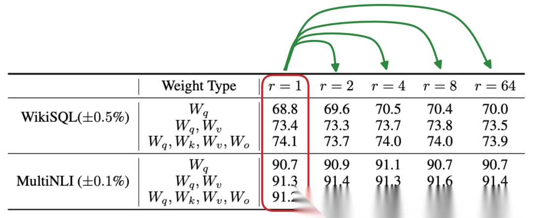 LoRA 的一个很酷的点是超参数r可以比相应权重矩阵的维度小几个数量级。例如,在结果表中,比较r=1与其他等级一样: