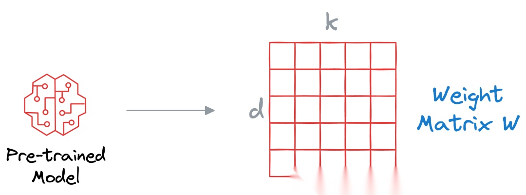 回顾神经网络的结构,绝大部分都是矩阵计算。考虑预训练模型中某些随机层的当前权重W 的维度是d*k,我们希望在某一个数据集上对其进行微调。