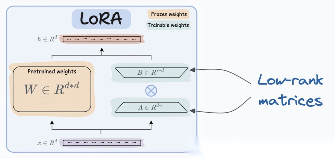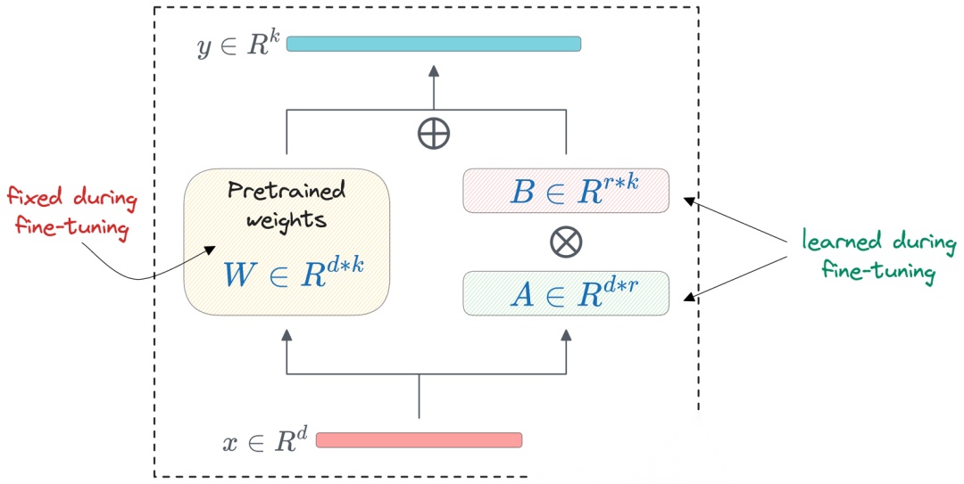 这里,W是基础模型的参数,A和 B 是可学习的参数。如上图所示,矩阵A 和 B 的维度与 W相比,尺寸要小得多西,导致可训练参数的数量显著减少。尽管这种低秩更新很简单,但它被证明在保留 LLM 的细微功能的同时,引入针对新任务或数据集所需的调整方面非常有效。
