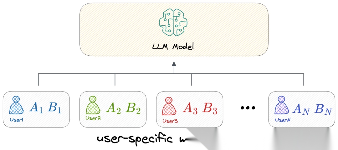 这样,如果有很多用户希望微调 LLM 模型(例如来自 OpenAI),OpenAI 只需存储上述两个矩阵A和B 。这对于引入此功能的所在层的参数来说,其尺寸非常小。然而,原始权重矩阵W 在所有微调版本中并没有被改变,即可以在所有用户之间共享的版本。