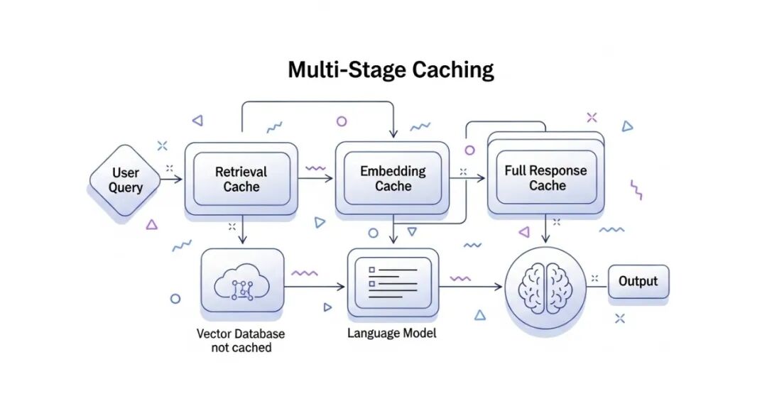 A flowchart illustrating the concept of multi-stage caching within a large-scale RAG system, showing different cache layers like query cache, retrieval cache, embedding cache, and full response cache, and how requests flow through them.