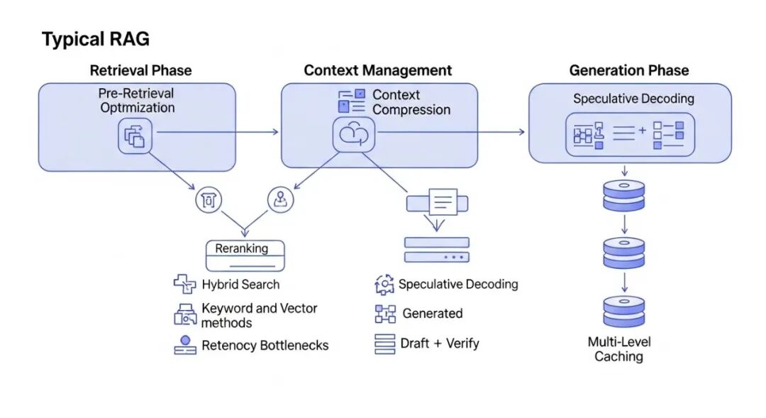 A diagram showing a typical RAG pipeline with highlighted latency bottlenecks and potential optimization points across retrieval, context management, and generation phases, including pre-retrieval, hybrid search, reranking, context compression, speculative decoding, and multi-level caching.