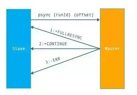 上面是 Psync 的执行流程,从节点发送 psync[runId][offset] 命令,主节点有三种响应:
