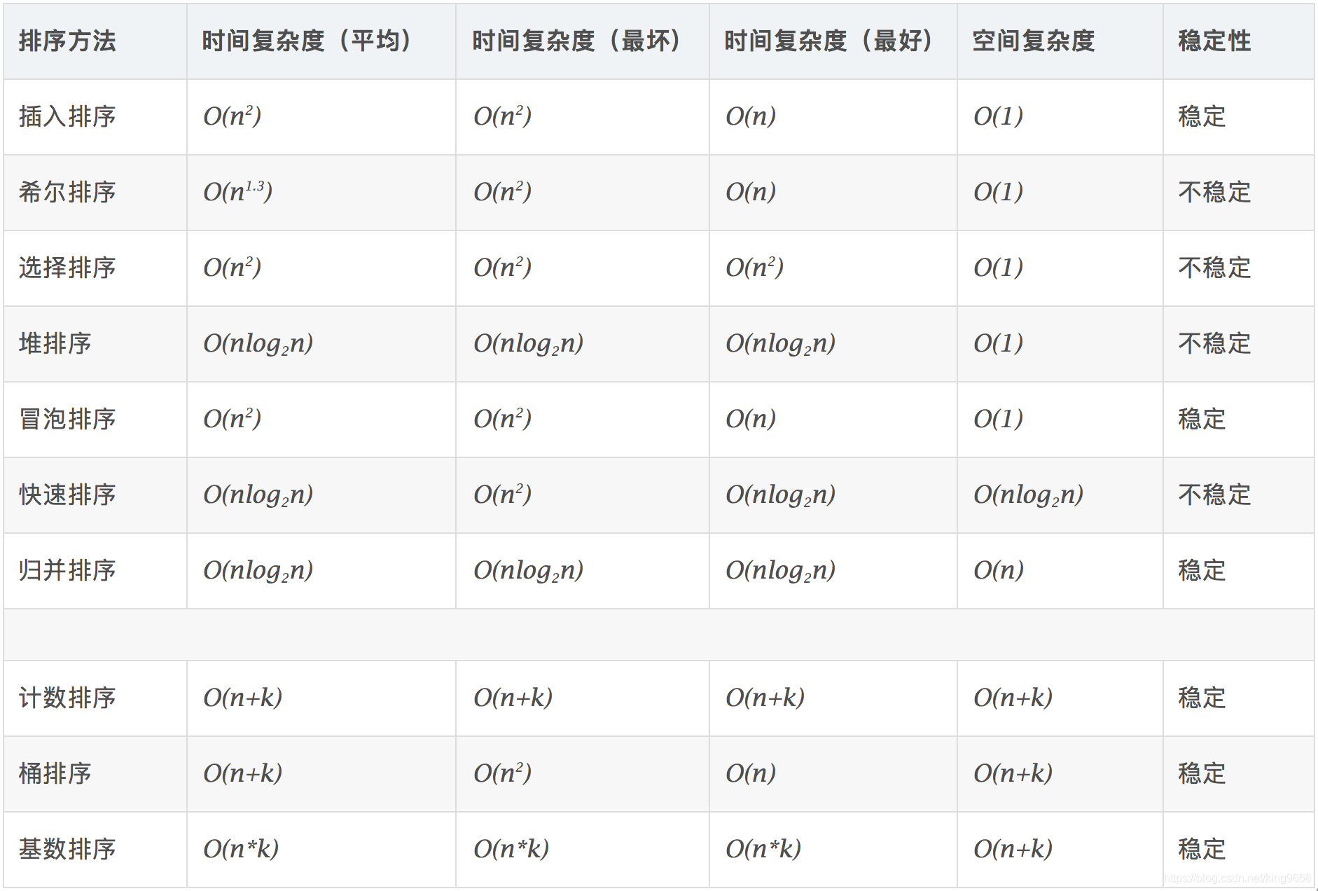 ✔ 稳定的排序算法有:冒泡排序、插入排序、归并排序、计数排序、桶排序、基数排序。