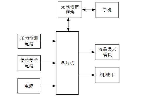 本设计仿生机械手臂电器控制系统的系统架构如图2.1所示,系统采用STM32F103单片机作为控制器,通过四个SG90舵机实现对机械臂的控制,以此实现机械臂的前、后、左、右、上、下、夹紧、松开等不同状态的运动控制,并通过压力传感器检测机械臂的夹紧握力,同时通过OLED液晶显示当前机械臂的坐标信息,同时采用HC05蓝牙模块实现与手机APP的通信。用户可以通过手机APP实现对机械臂的运动控制。