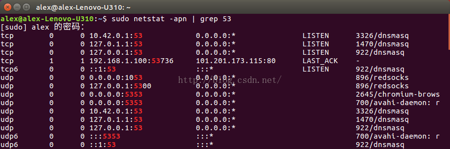 注:之所以有127.0.0.1:53而没有192.168.1.100:53或者0.0.0.0:53是Ubuntu默认不向局域网开放自己的53端口,理由当然是为了安全,防止让你真的变成一台局域网DNS服务器,而有10.42.0.1:53的原因是本计算机分享了一个Wifi,在这个Wifi局域网中,这台电脑既当网关也当DNS服务器,该wifi中的所有电脑被DHCP分配到的DNS服务器均为10.42.0.1,所以对于这个内网,dnsmasq是向局域网开放自己的53端口的。