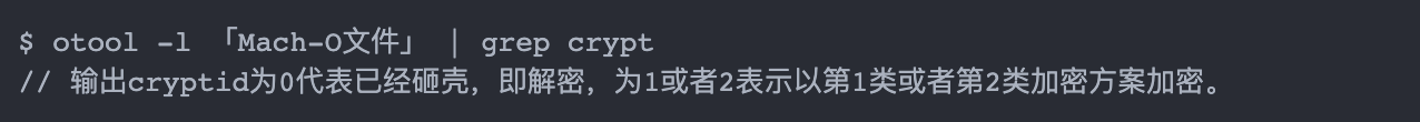 主要通过codesign命令完成。值得说明的是:我们要想对ipa进行重签名,那么这个ipa包一定是未被加密过的,如何查看是否被加密过?使用如下命令:
