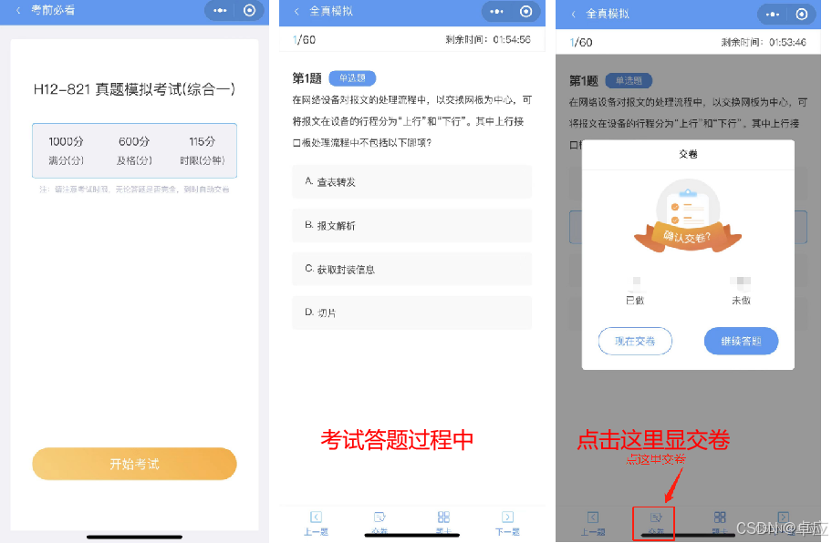 8.进入答题页面,选择答案后按顺序以此完成答题,答题结束,点击【交卷】,提交交卷后将显示你的分数和答题正确率。