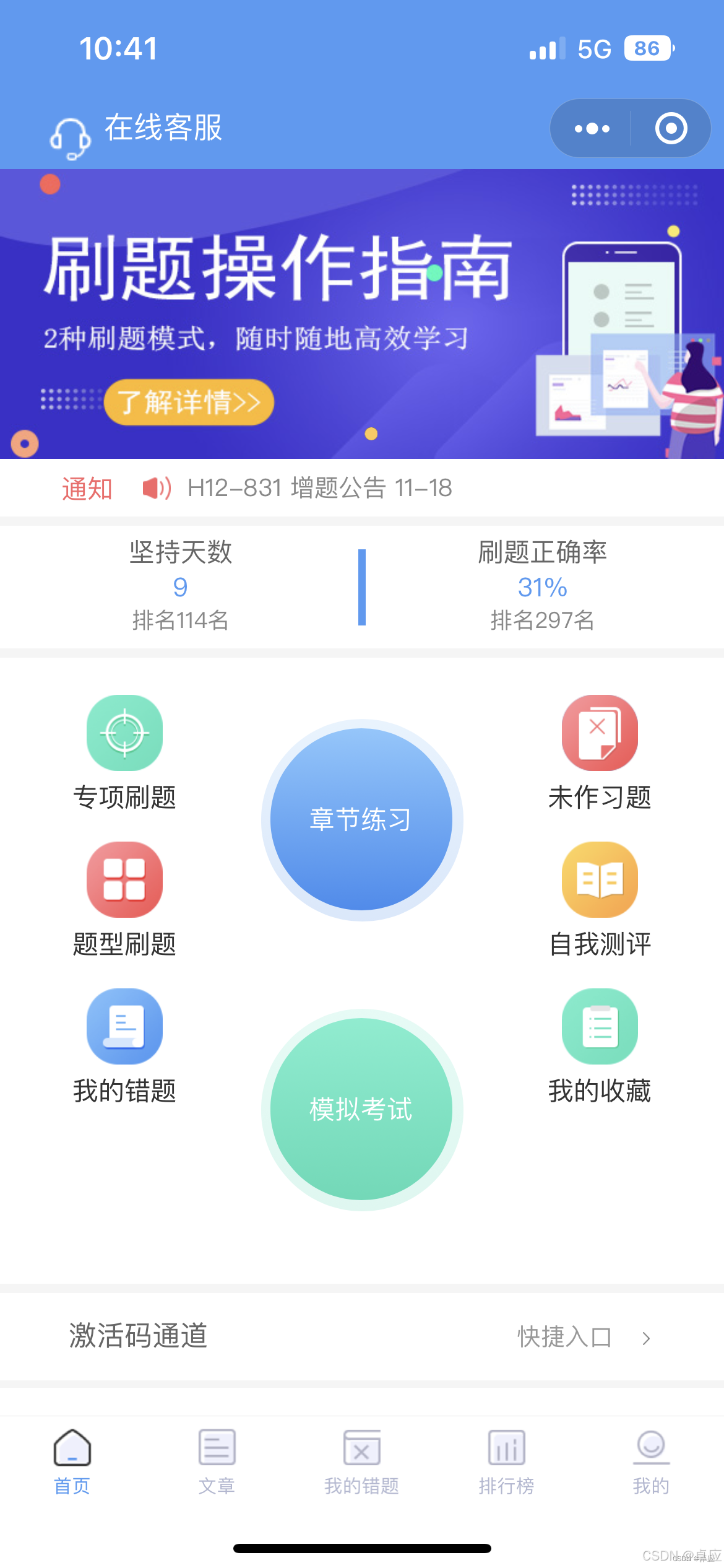 从主页面看,包含章节练习、模拟考试、错题集等常用操作。