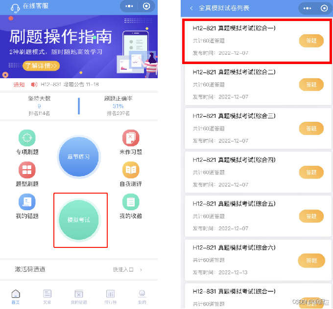 7.点击【模拟考试】,点击【全真模拟】,选择对应模拟卷