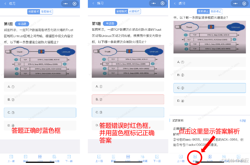 4.答题模式需自己先选择答案,如选择正确,则蓝色框标记,如答案错误,则红色框标记,并同步用蓝色框标记正确答案,可通过解析查看答案。