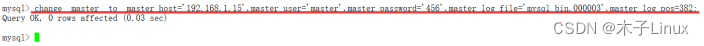 mysql> change master to master_user='master',master_password='123',change master to master_host='192.168.43.20',master_log_file='mysql-bin.000003',master_log_pos=383;