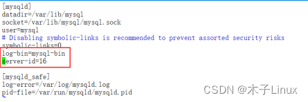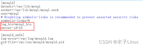 server-id=15#一个主从环境下主从服务器要有自己的服务编号,编号一般以IP地址主机位作为编号,同一个主从环境中,server-id不能冲突,否则会报错