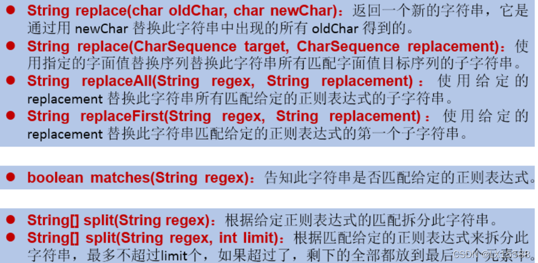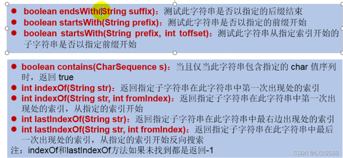 - char charAt(int index):返回某索引处的字符return value[index] 注意这里的下标要从零开始