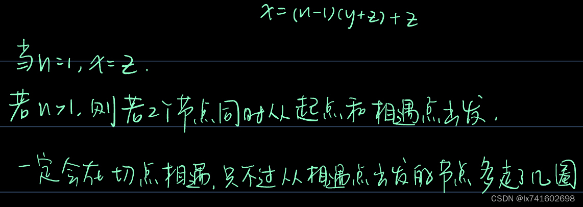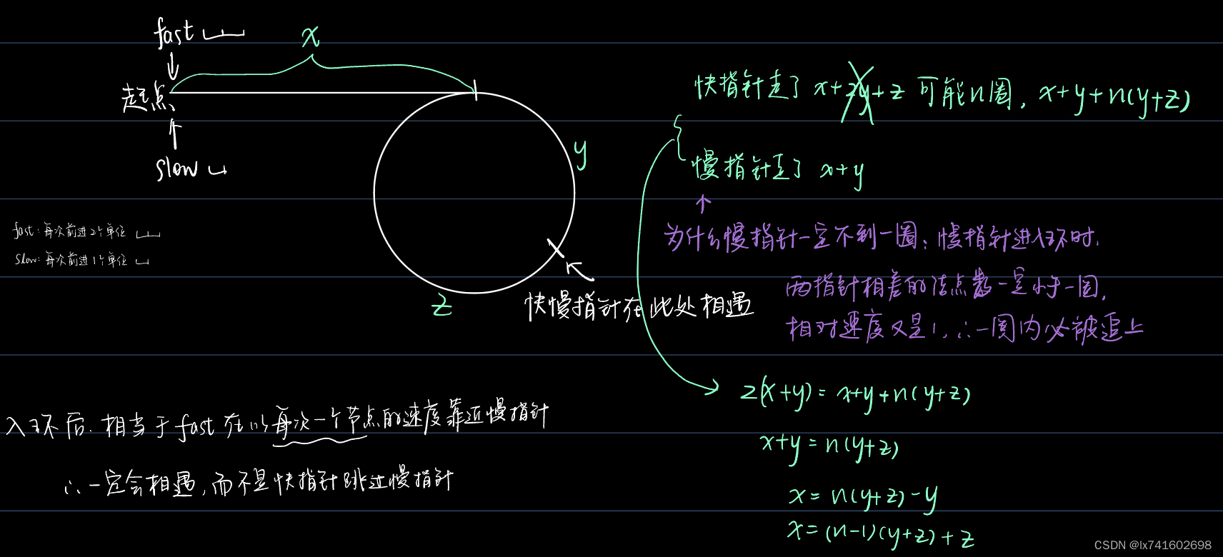 快慢指针,如图所示,fast走的路程为x+y+n(y+z),slow走的路程为x+y。