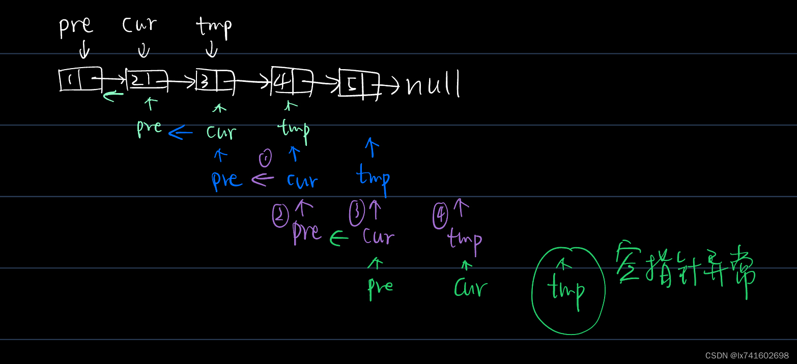 我的思路是这样的,相当于三个指针在动,核心是让cur指向pre,tmp是用于暂存后面结点的,以免丢失后面的结点。如图所示,带有圆圈的1 2 3 4是步骤顺序。