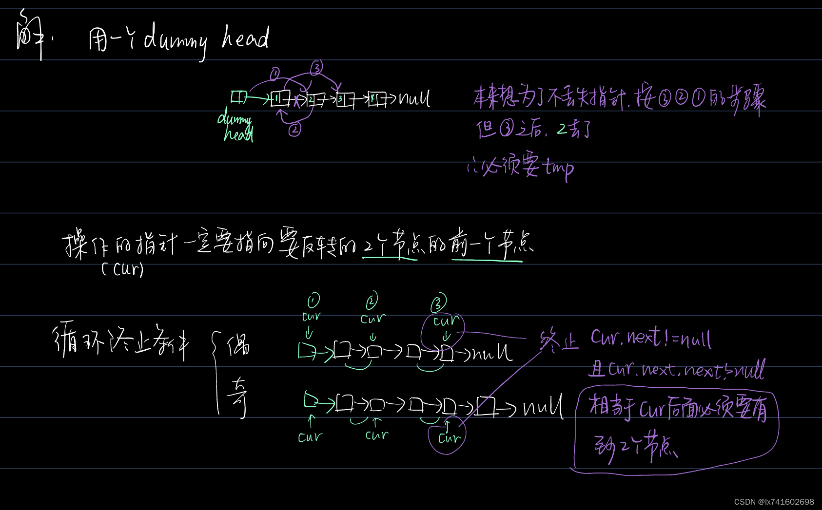 1. while循环的进入条件,是cur!=null,之前想写cur.next!=null,你就想cur为最后一个结点时,进不进循环,实际是要进的,因为最后一个结点还没指向倒数第二个结点呢,所以不能这么写。还有就是,可以写成while(cur)这样更简洁。