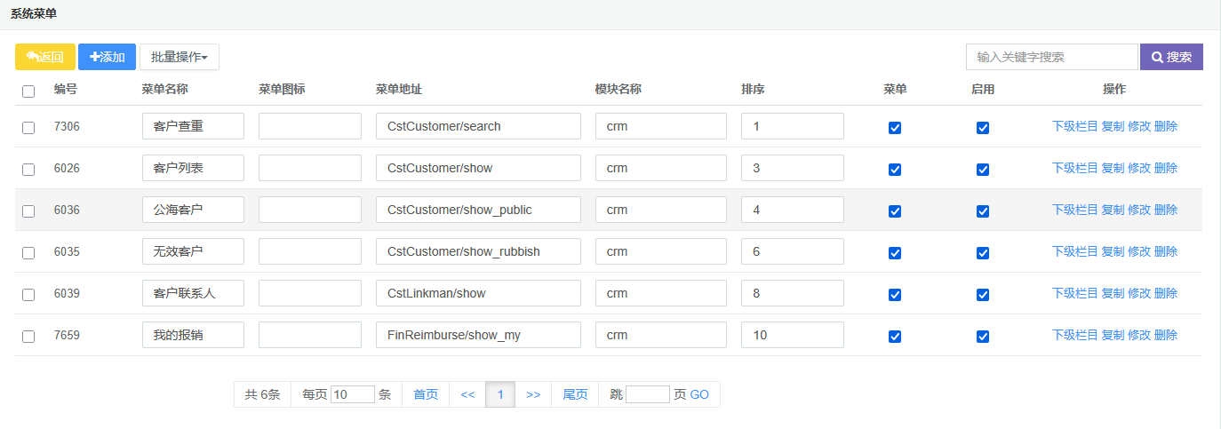 1,把菜单的配置放在数据库上,每一个菜单对于一个唯一的编码MenuNo,每一个“叶节点”的菜单项对于一个页面(url)。本系统这里是通过URL地址来作为标识。