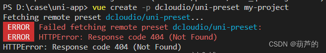 uni-app创建项目报错Failed fetching remote preset dcloudio/uni-preset: HTTPError: Reponse code 404 下载后使用如下命令创建项目,其中test就是我的项目名称。命令为vue create -p GitHub上下载项目的路径 项目名称。创建cli工程,会远程下载 dcloudio/uni-preset-vue,拉取失败时,可以通过手动下载来创建项目。下载后文件放入的文件夹。