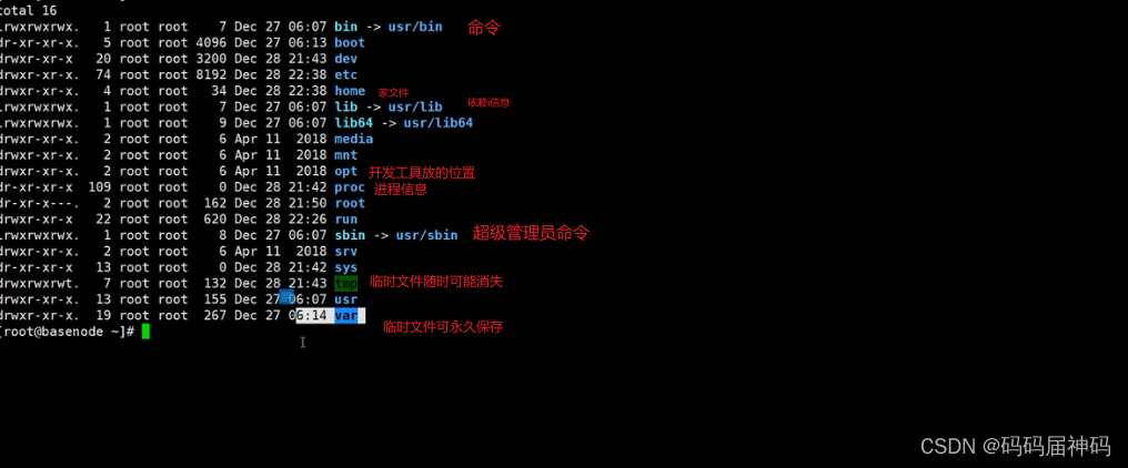 bin:可执行文件。boot:引导分区 dev:设备信息 etc:系统配置文件