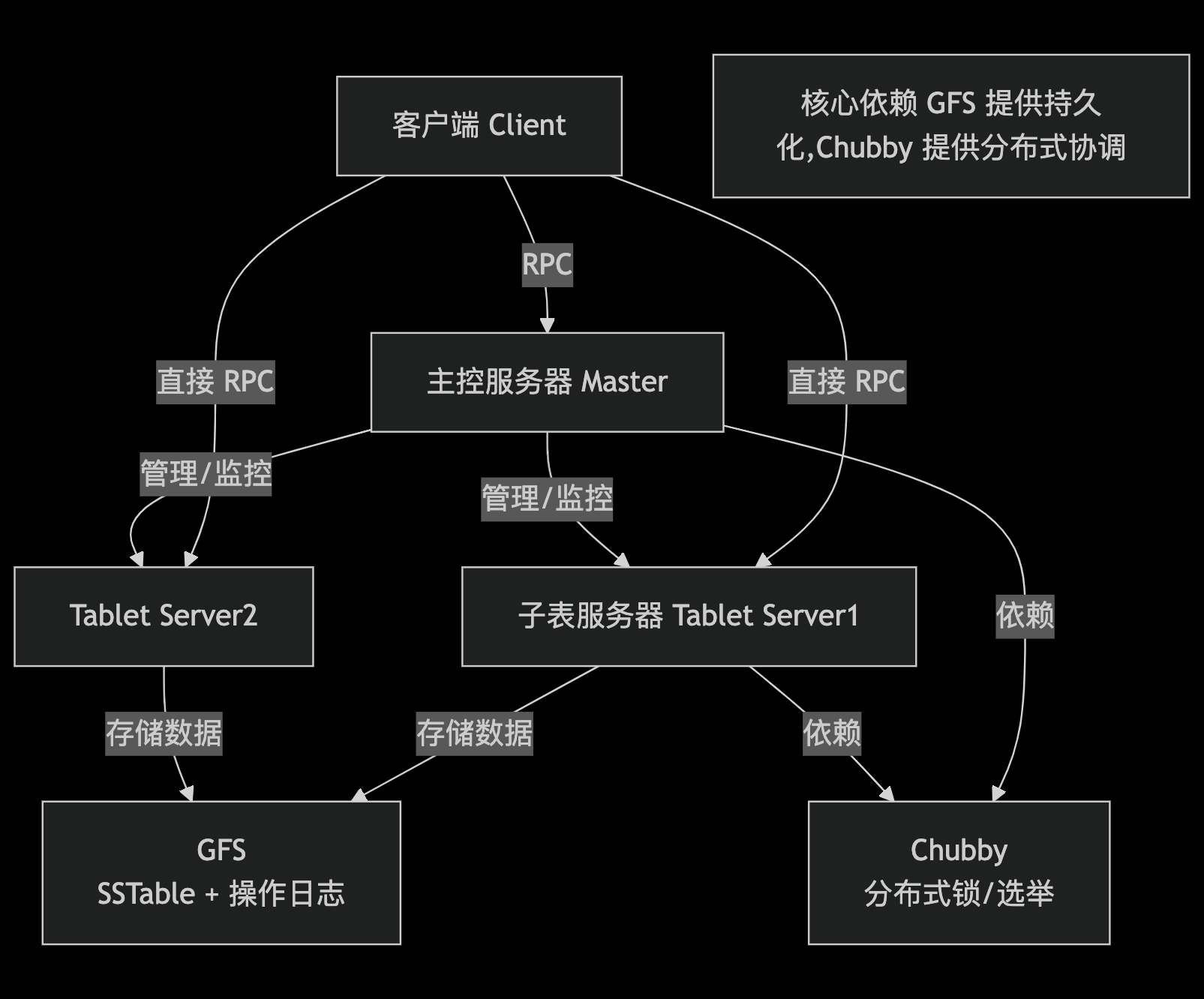 Bigtable 采用 分层架构,底层依赖 Google 其他基础设施,上层通过分布式服务实现数据的存储与管理。整体架构可分为 客户端层、主控服务器(Master)、子表服务器(Tablet Server) 三大核心组件,依赖 GFS(持久化存储)和 Chubby(分布式锁服务)提供基础支撑。