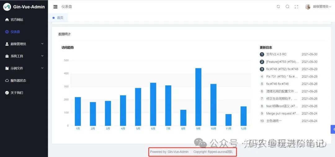 11、gin-vue-adminhttps://github.com/flipped-aurora/gin-vue-admin基于vite+vue3+gin搭建的开发基础平台(已完成setup语法糖版本),集成jwt鉴权,权限管理,动态路由,显隐可控组件,分页封装,多点登录拦截,资源权限,上传下载,代码生成器,表单生成器等开发必备功能,五分钟一套CURD前后端代码。项目截图: