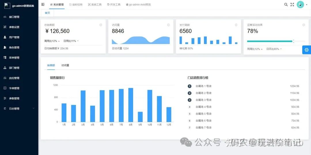 6、go-adminhttps://github.com/go-admin-team/go-admin基于Gin + Vue + Element UI的前后端分离权限管理系统脚手架(包含了:多租户的支持,基础用户管理功能,jwt鉴权,代码生成器,RBAC资源控制,表单构建,定时任务等)3分钟构建自己的中后台项目;文档:https://doc.go-admin.devDemo:https://www.go-admin.devAntd beta版本:https://preview.go-admin.dev