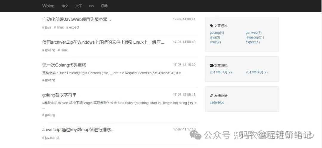 13、wbloghttps://github.com/wangsongyan/wblog基于gin+gorm开发的个人博客项目项目结构:-wblog |-conf 配置文件目录 |-controllers 控制器目录 |-helpders 公共方法目录 |-models 数据库访问目录 |-static 静态资源目录 |-css css文件目录 |-images 图片目录 |-js js文件目录 |-libs js类库 |-system 系统配置文件加载目录 |-tests 测试目录 |-vendor 项目依赖其他开源项目目录 |-views 模板文件目录 |-main.go 程序执行入口