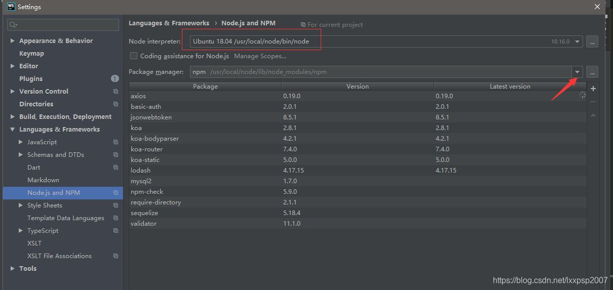 Settings -> Languages & Frameworks -> Node.js and NPM
