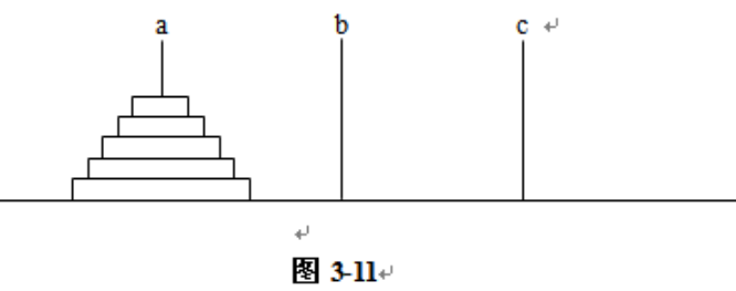 问题的提出:Hanoi塔由n个大小不同的圆盘和三根木柱a,b,c组成。开始时,这n个圆盘由大到小依次套在a柱上,如图3-11所示。 要求把a柱上n个圆盘按下述规则移到c柱上: