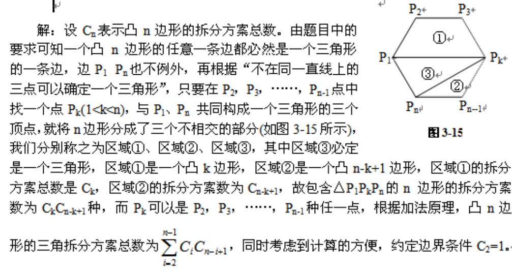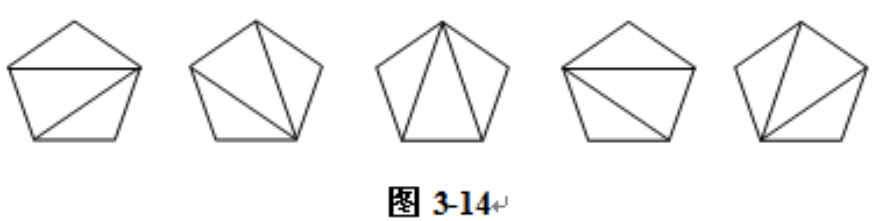 问题的提出:在一个凸n边形中,通过不相交于n边形内部的对角线,把n边形拆分成若干三角形,不同的拆分数目用hn表示,hn即为Catalan数。例如五边形有如下五种拆分方案(图3-14),故h5=5。求对于一个任意的凸n边形相应的hn。