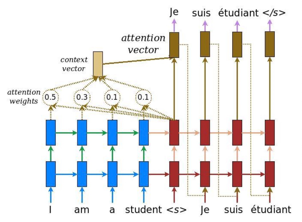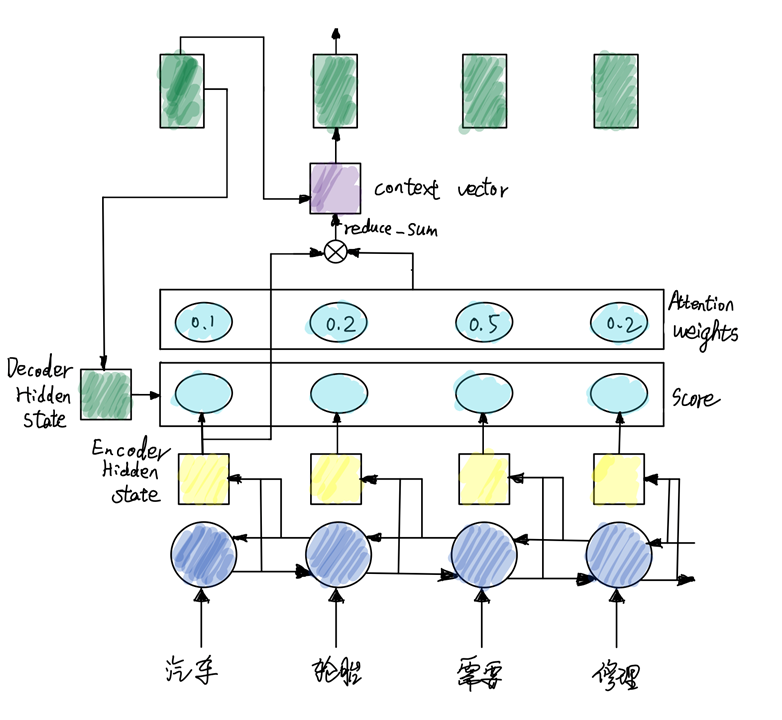 令encoder hidden为 h ‾ s \overline h_{s} hs,decoder hidden为 h t h_{t} ht。在decoder过程中,t时刻的输出需基于 h t − 1 h_{t-1} ht−1和所有的encoder hidden state计算相似度,得到attention权重 α t s = s o f t m a x ( s c o r e ( h ‾ s , h t − 1 ) \alpha_{ts}=softmax(score(\overline h_{s},h_{t-1}) αts=softmax(score(hs,ht−1),从而计算该时刻的context vector为 c t = ∑ j = 1 s α t j h ‾ j c_t=\sum_{j=1}^s \alpha _{tj} \overline h_{j} ct=∑j=1sαtjhj,然后与 h t h_t ht进行拼接。其中score为距离函数,可使用内积 h t − 1 T w h ‾ s h^T_{t-1}w\overline h_s ht−1Twhs即LuongAttention。也可采用 v a T t a n h ( w 1 h ‾ s + w 2 h t − 1 ) v^T_atanh(w_1\overline h_s+w_2h_{t-1}) vaTtanh(w1hs+w2ht−1)即BahdanauAttention,其中 v a 、 w 1 、 w 2 v_a、w_1、w_2 va、w1、w2基于神经网络训练得到。