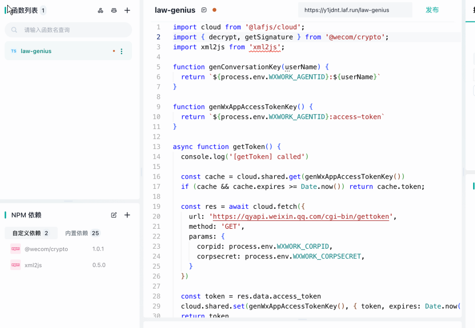 在创建好云函数中,删除默认的代码,并将文末“附录”中的代码全部粘贴到这里。