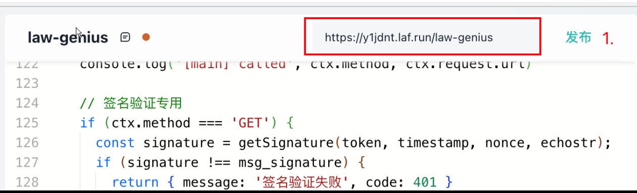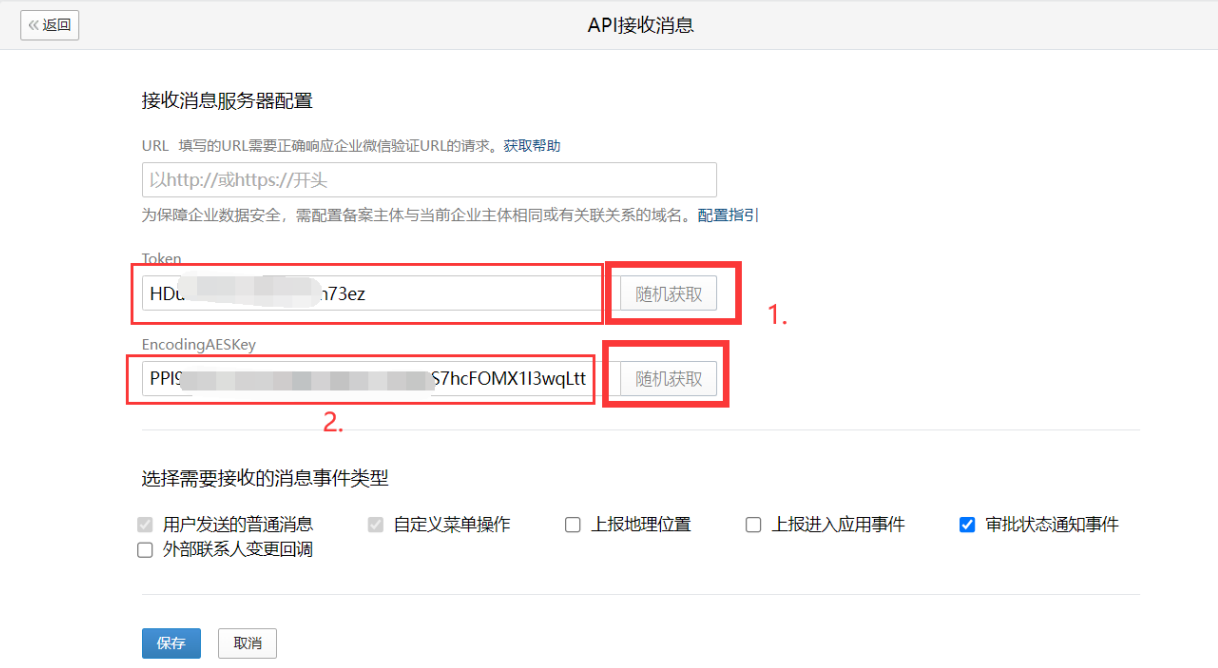 在 API 接收消息页面,点一下两个【随机获取】按钮,它会自动生成一个 Token 和 EncodingAESKey,我们分别记为 WXWORK_TOKEN 和 WXWORK_AESKEY。注意,不要关掉这个页面,Laf 侧配置完毕后我们再来填写 URL。