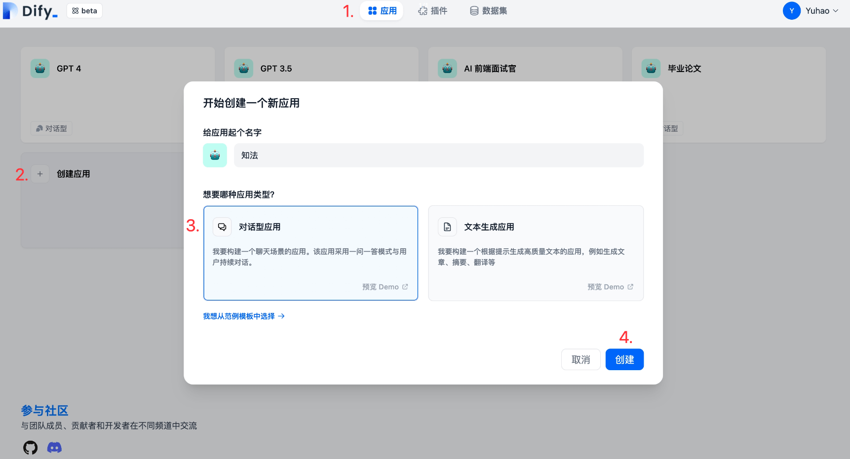 创建应用:根据图中的指示,创建一个对话型应用,并命名为“知法”。