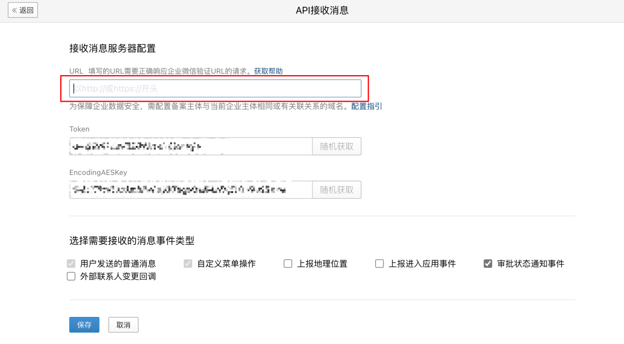现在把 URL 粘贴到企业微信后台【设置 API 接收】的页面中刚刚留白的地方,然后点击保存。