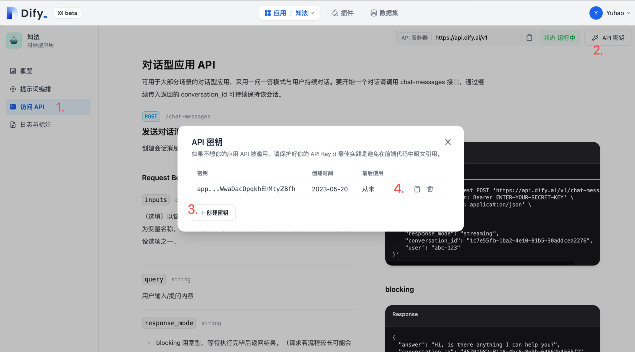 获取 API 访问密钥。在“访问 API”页面,创建一个 API 密钥并复制保存为DIFY_APPTOKEN。请注意不要把密钥泄漏给任何人,以免造成财产损失。