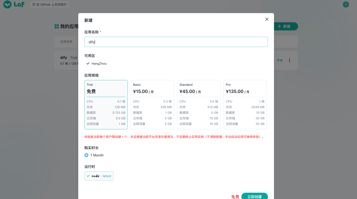 新建 Laf 云应用:进入 Laf 后,点击新建,创建一个云应用。这里选择免费的计划即可。