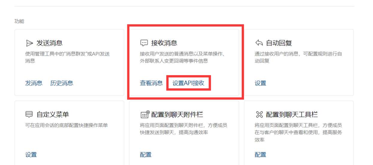企业微信应用接收信息:在应用详情页面,接收消息处点击【设置 API 接收】。