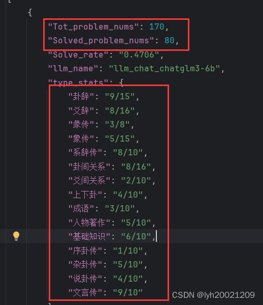 4. 对1、2的结果,累加至solve_rate下的solve_rate.json文件中,例如,微调100轮带知识库的总计10/21(我瞎说的数字),分类1:卦辞3/5,分类2:... 将其对应累加至响应项上