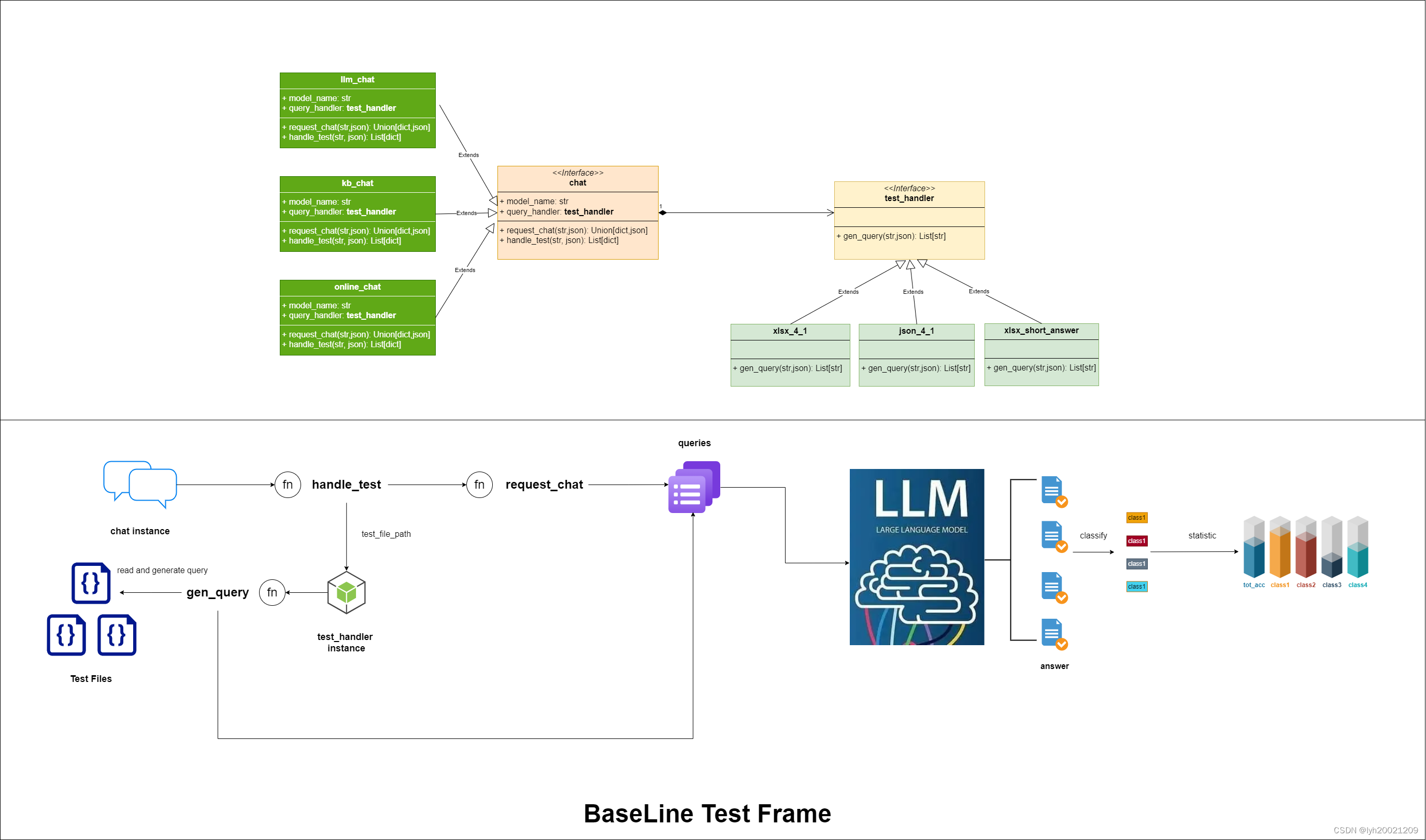- 对于每个大模型对话的抽象类chat的实现类的实例(我们将对这个实例输入一些基于评测集的问题,并让他产生回答,之后记录该回答),都组合了一个test_handler抽象类的实现类的实例,这个实例负责从某种指定类型的结构化文本中产生问题(比如从一个xlsx文件中产生问题)。