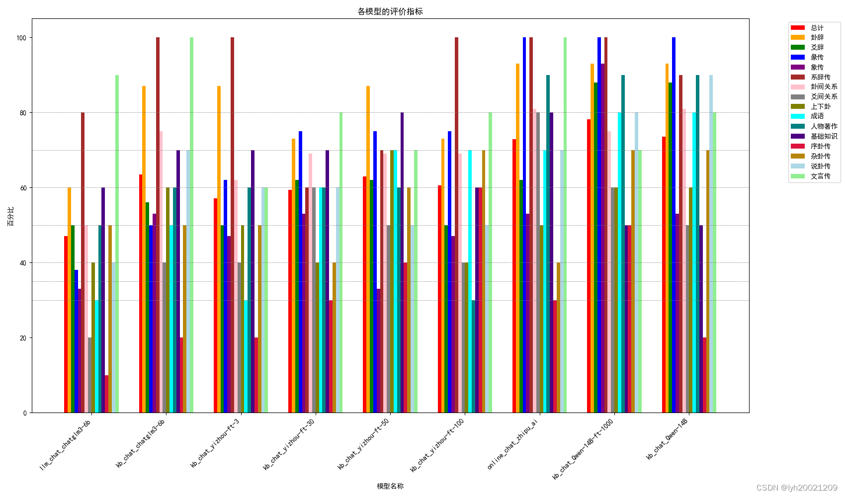 - 得到所有回答后,我们保存成一个结构化文本。由于这些问题是带分类标签的(例如,卦辞、爻辞、卦间关系等等),我们可以基于标签将其分类,统计每一个分类下的正确率,随后进行图表的绘制。