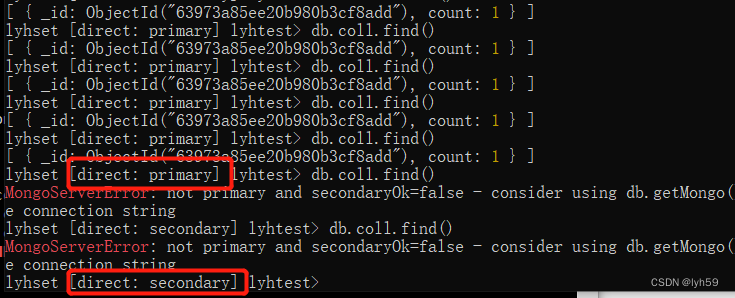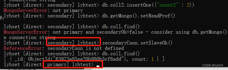 然后重启主节点,由于最开始配置时 主节点的priority数值更大,因此mongo2将会从主节点退回从节点,不能进行读写操作。