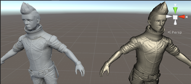 两个shader的对比,左边是模型原本的shader,右边是上面的shader。左边的有一种泥瓦的质感,而右边的有一种金属的质感。
