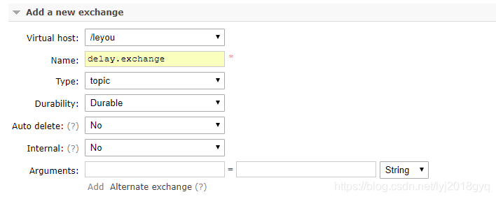 这里Internal设置为NO,否则将无法接受dead letter,YES表示这个exchange不可以被client用来推送消息,仅用来进行exchange和exchange之间的绑定。