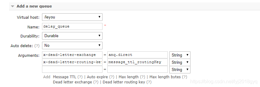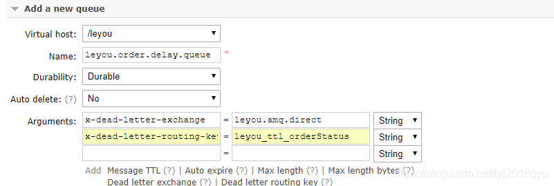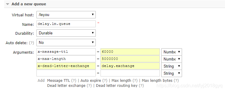 x-dead-letter-exchange:设置为刚刚配置好的delay.exchange,消息过期后会通过delay.exchange进行投递